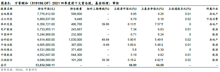 万家基金的另一只上榜基金为万家颐和(519198.OF),由章恒担任基金经理。从2021四季报重仓股来看,房地产、能源依旧是持仓的主要领域。但章恒的持仓集中度低于黄海,前十大重仓股占股票市值比不到70%,并且石头科技(688169.SH)作为第二大重仓股属于可选消费板块。