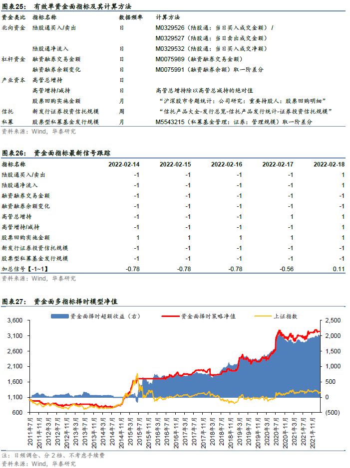 在华泰金工择时系列报告《A股择时之资金面指标测试》(2021-07-02)中,我们将参与A股投资的资金分为产业资本和金融资本,又将金融资本细分为境外机构投资者(北向资金)、境内机构投资者(公募基金、信托、私募、券商资管、保险)、境内个人投资者、杠杆资金等大类;在各资金类型中遴选和构建代表性指标,并采用统一的择时框架进行测试。以上证指数及其同期的最佳择时策略为参照,从北向资金、杠杆资金、产业资本、信托、私募类资金中筛选出9个有效的择时指标如下,并基于单指标测试结果构建多指标择时策略。根据2022年2月19日最新建模结果,陆股通买入/卖出、陆股通资金净流入、高管总增持、高管增持/减持、股票回购实施金额发出看多信号,融资融券交易金额、融资融券余额变化、股票私募基金管理规模变化、新发行证券投资信托产品发行规模发出看空信号,在[-1~1]区间中,加总信号得分为0.11。