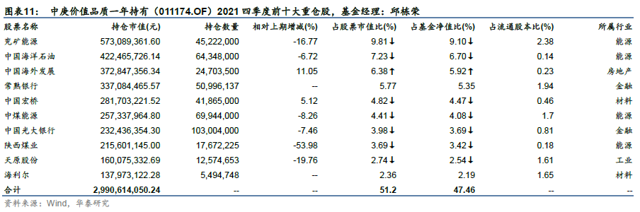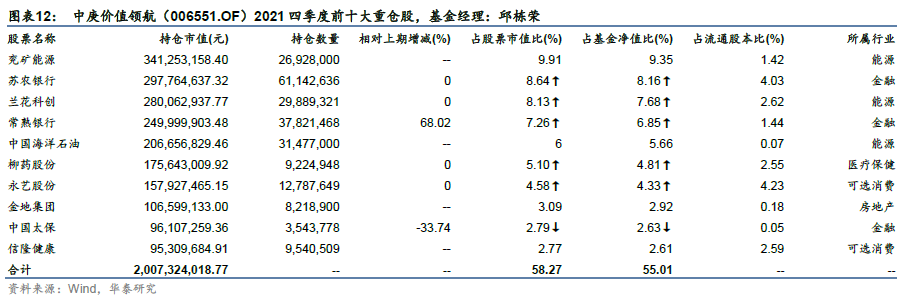 另外位列业绩前10的基金中庚价值品质一年持有(011174.OF)和中庚价值领航(006551.OF)由邱栋荣管理,前十大重仓股在能源、房地产、金融、材料等板块上均有分布,持股集中度不高。整体持股偏向低估值蓝筹风格,防御性较强。