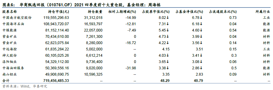 主要投资能源、材料方面的基金还有华商甄选回报(010761.OF),由周海栋管理。他的前十大重仓股占股票市值比不到50%,分散度较好,主要投资于能源和矿产领域。