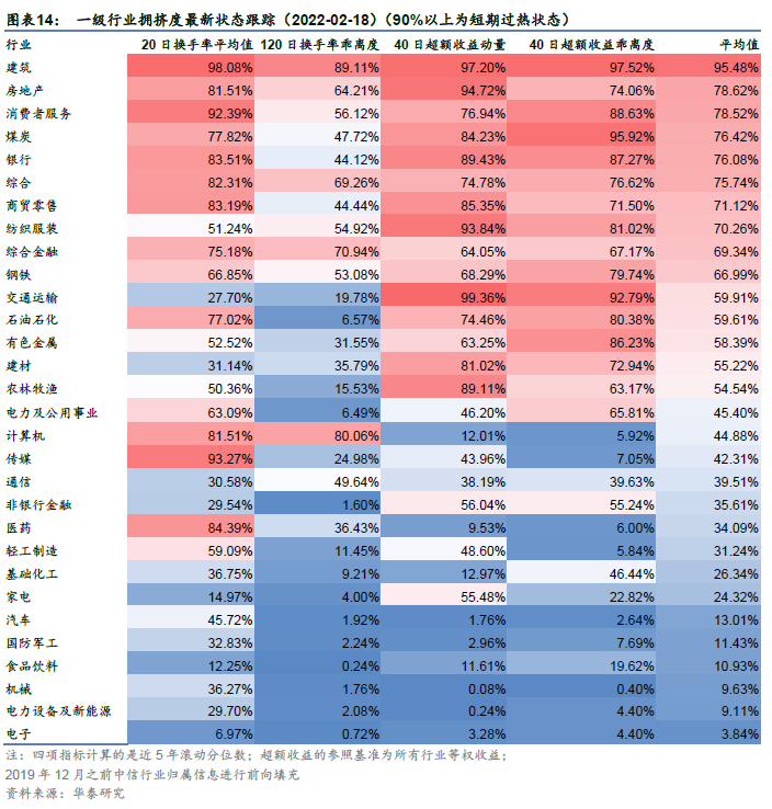 在《A股择时之资金面指标测试》(2021-07-02)中,我们在产业资本和境外机构投资者、境内机构投资者、境内个人投资者等各资金类型中遴选和构建代表性指标,并采用统一的择时框架进行测试,筛选出9个有效的择时指标,并基于单指标测试结果构建多指标择时策略。根据2022年2月19日最新建模结果,陆股通买入/卖出、陆股通资金净流入、高管总增持、高管增持/减持、股票回购实施金额发出看多信号,融资融券交易金额、融资融券余额变化、股票私募基金管理规模变化、新发行证券投资信托产品发行规模发出看空信号,在[-1~1]区间中,加总信号得分为0.11分,整体谨慎看多。