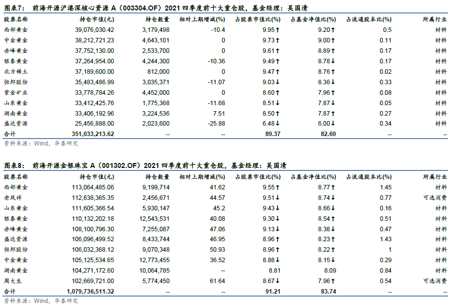 前海开源的基金经理吴国清所管理的前海开源沪港深核心资源A(003304.OF)。但值得注意的是,该基金前十大重仓股主要投资于黄金、稀土相关的标的,与其管理的另一只基金前海开源金银珠宝A(001302.OF)持仓相似度较高。由于近期国内外股市回调,以及地缘政治风险的爆发,贵金属价格一路走高,因此重仓黄金股的这两只基金都取得了不错的业绩。和前海开源金银珠宝A(001302.OF)今年业绩表现也较好。