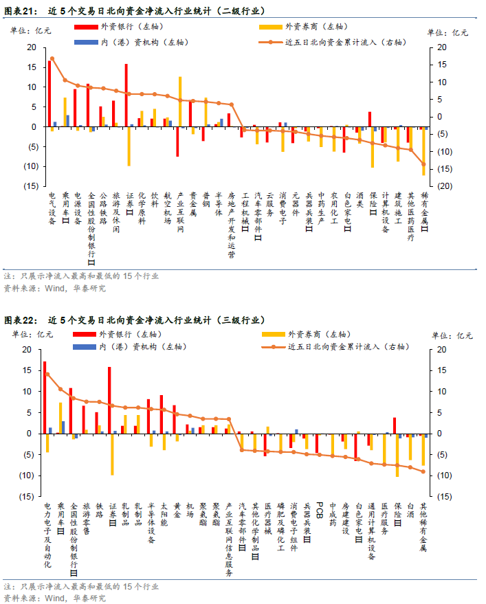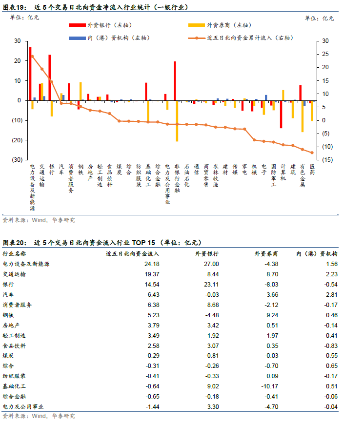 上周北向资金加仓最多的行业是电力设备及新能源(24.18亿元)、交通运输(19.37亿元)、银行(14.54亿元),减仓最多的行业是建筑(-9.49亿元)、有色金属(-11.01亿元)、医药(-12.26亿元)。