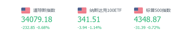 上周道指下跌1.9%,标普500指数下跌1.58%,纳指下跌1.76%,均为连续第二周下滑。截止上周五收盘,道指下跌232.85点,跌幅为0.68%;纳指跌168.65点,跌幅为1.23%;标普500指数跌31.39点,跌幅为0.72%。