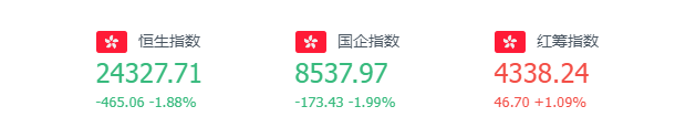 恒生指数上周跌2.32%,报24327.71点;恒生科技指数上周跌2.09%,报5479.9点;国企指数上周跌2.81%,报8537.97点。截至上周五收盘,恒生指数跌1.88%,报24327.71点;国企指数跌1.99%,红筹指数跌涨1.09%。
