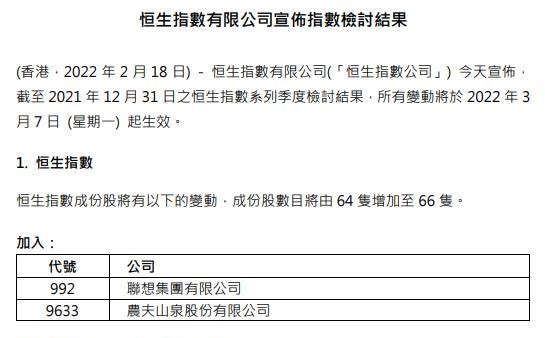 恒指公司公布2021年第四季度季检结果,联想、农夫山泉获纳入恒生指数