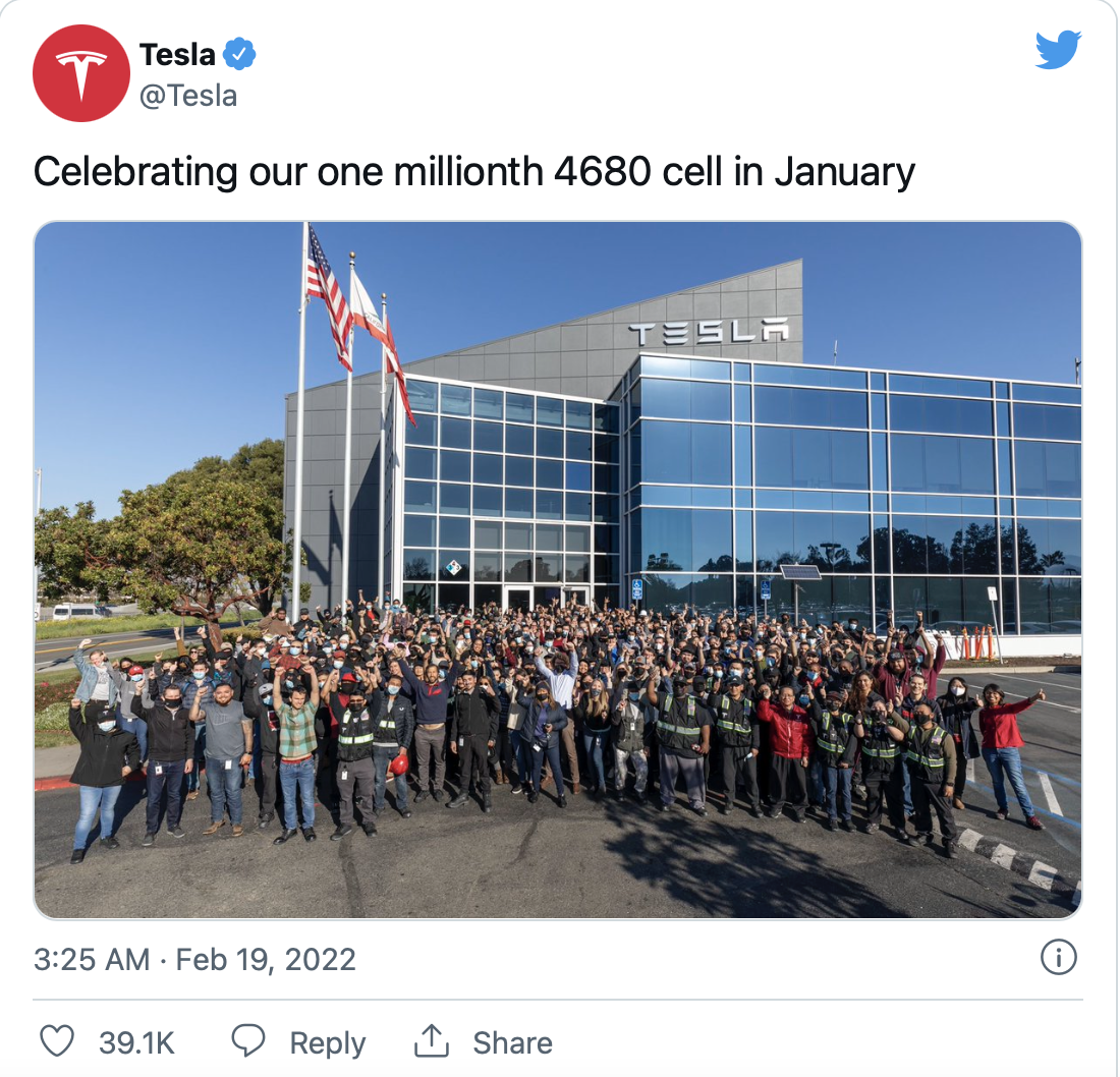 特斯拉19日发推文表示,加州的试点工厂在1月份生产了100万块4680电池,标志着4680电池正式进入量产阶段。4680电池的存储容量将是2170电池的5倍,功率则高达6倍,预计可使车辆续驶里程增加16%,成本下降14%。