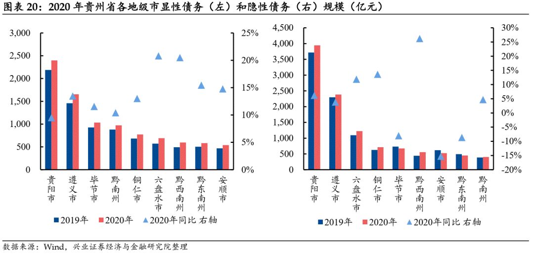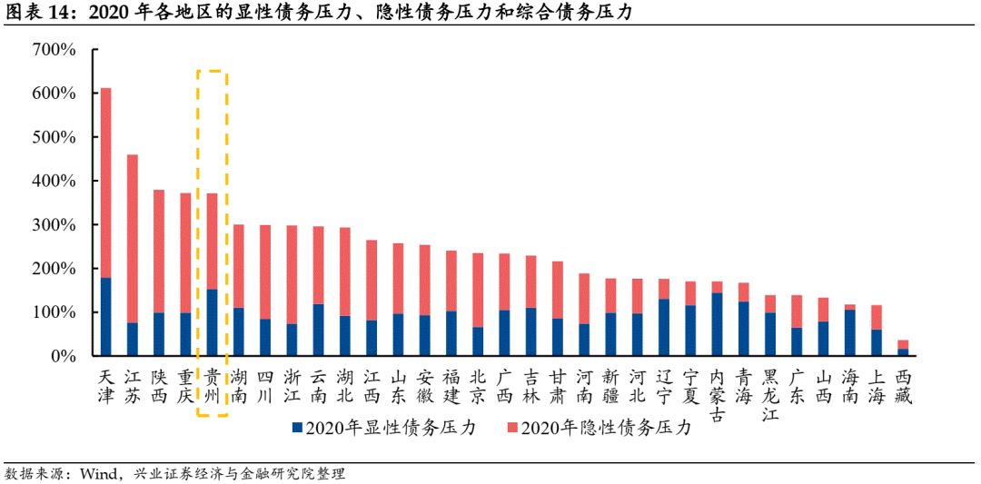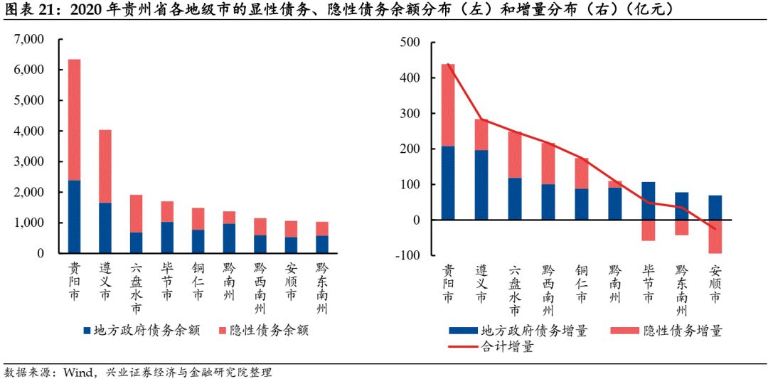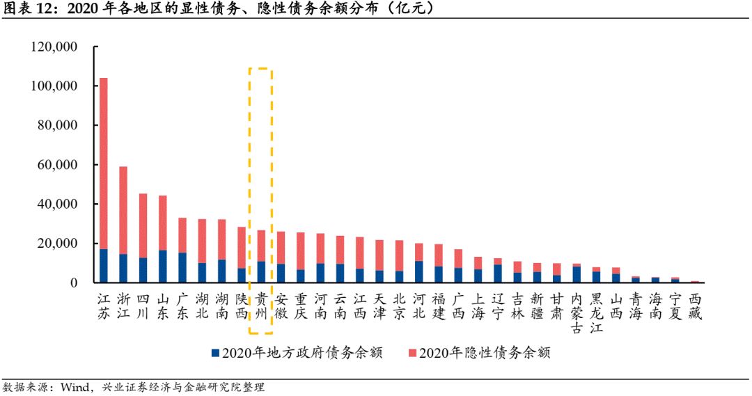 从存量角度来看,贵州地区的显性债务和隐性债务余额都处于全国上游水平。