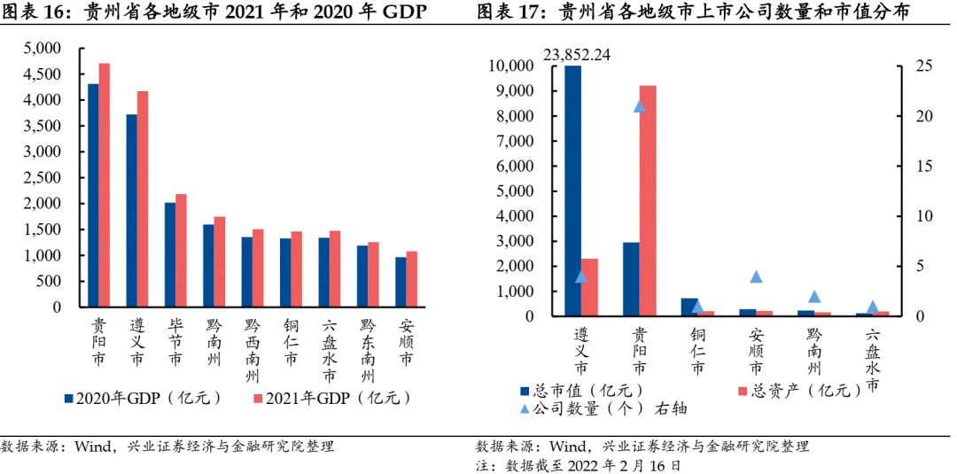 经济实力维度:贵阳和遵义2021年GDP总量位居前两位,并明显高于其他各地级市;贵阳和遵义的上市公司总市值也明显高于其他地区。