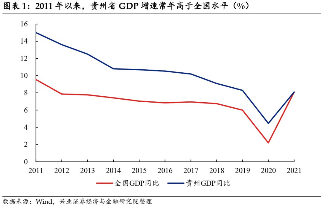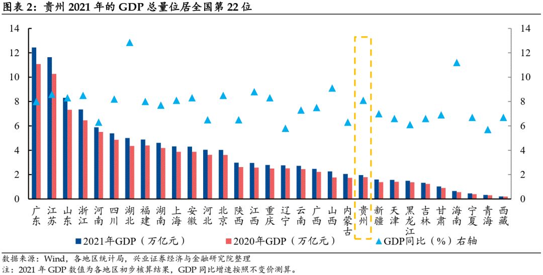 从GDP增速来看,2011年以来贵州省GDP增速常年高于全国,但近几年的增速差距有所收窄,2021年GDP增速与全国持平;横向对比来看,2021年贵州全省实现地区生产总值1.96万亿元,位居全国第22位,和2020年相比,贵州GDP总量被山西和内蒙古反超。