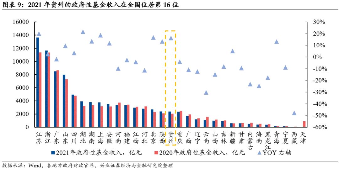 从政府性基金收入来看,贵州地区2021年实现政府性基金收入2380.70亿元,在全国位居第16位,同比大幅增长16.29%,涨幅居全国前列,同时也意味着贵州省对土地财政的依赖度可能相对较高。