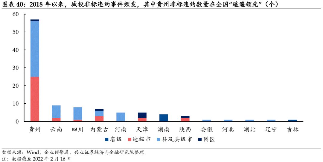 从地级市分布来看,遵义市发生城投非标违约事件最多,其次是黔南州、黔东南州等地区。
