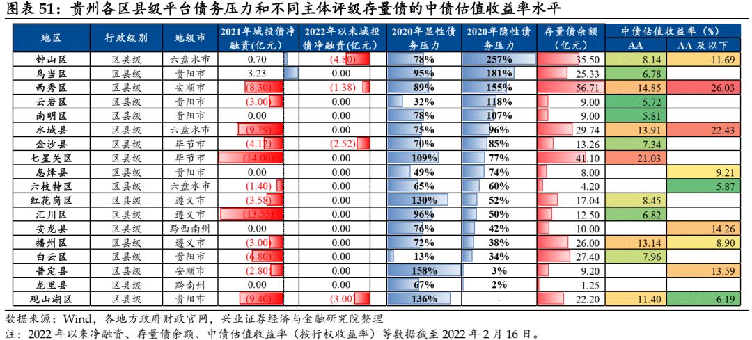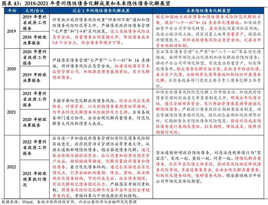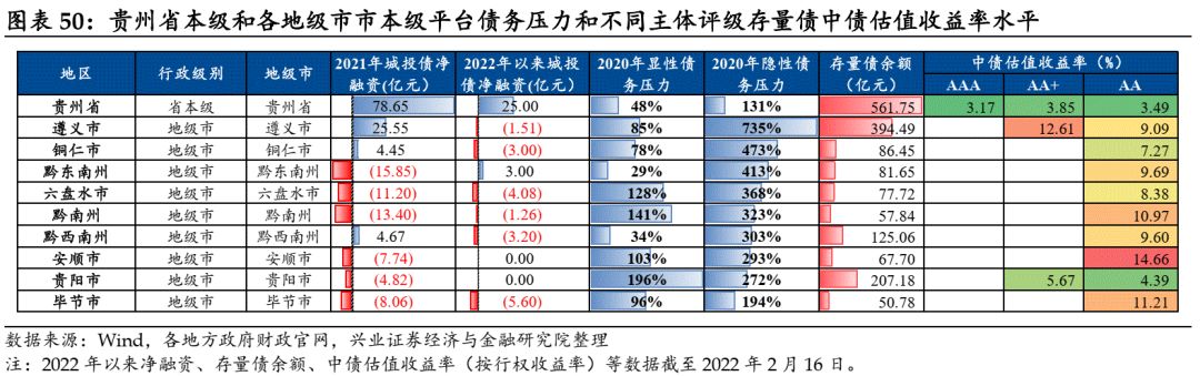 国务院2022年1月26日印发的《关于支持贵州在新时代西部大开发上闯新路的意见》中提到 “按照市场化、法治化原则,在落实地方政府化债责任和不新增地方政府隐性债务的前提下,允许融资平台公司对符合条件的存量隐性债务,与金融机构协商采取适当的展期、债务重组等方式维持资金周转”;考虑到2018年以来贵州地区已发生过多起城投非标逾期事件,这或意味着贵州对于纳入隐性债务的非标等债务或将更多通过“展期、债务重组等”方式来缓解城投平台的债务压力,这反而可能对于贵州城投债(尤其是公开债)的偿付形成一定利好。