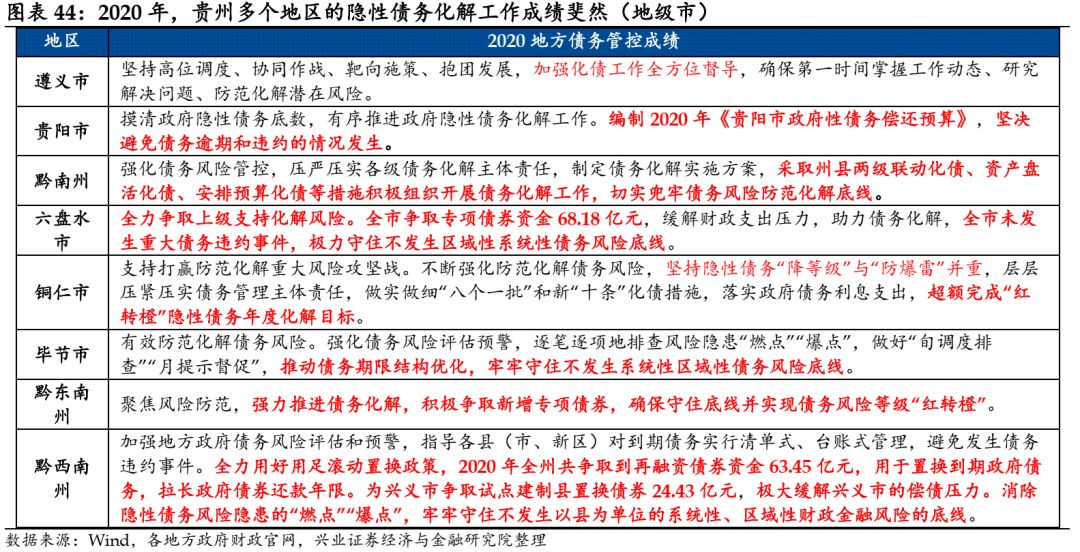 从地级市来看,诸如黔东南州提到“强力推进债务化解,积极争取新增专项债券,确保守住底线并实现债务风险等级‘红转橙’”;铜仁市提到“超额完成‘红转橙’隐性债务年度化解目标”;