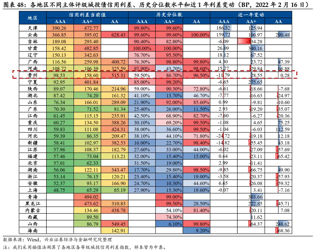 国发2号文等政策引导下,贵州“软实力”和“硬实力”有望进一步增强,为贵州城投债“信仰”带来支撑;从估值角度来看,当前贵州城投也有较高的超额价值。