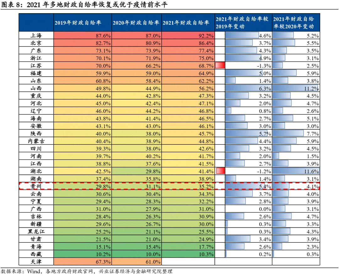 财政实力维度:2021年贵州的财政自给率有所回升,但依然偏弱;考虑中央转移支付后,贵州地区的财政实力有所提升,在全国接近中等水平。