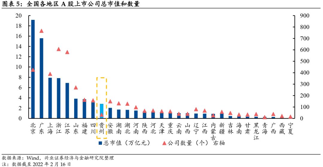 从全国各地区A股上市公司的分布情况来看,贵州省上市公司数量偏少(仅33家),但在贵州茅台的加持下,贵州上市公司总市值规模达2.8万亿元,处于全国第9。