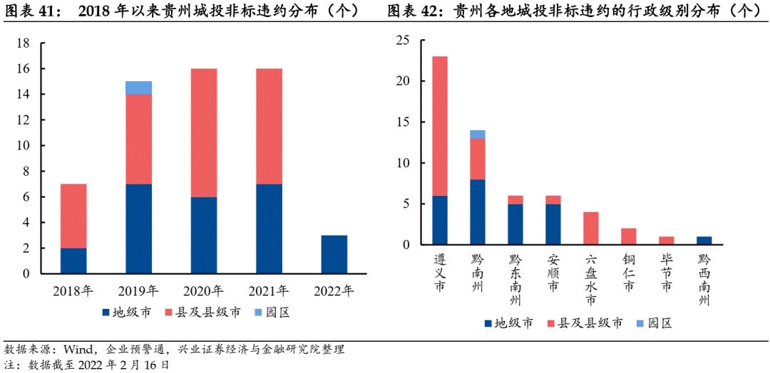 从时间分布来看,近年来贵州城投非标违约频发,2019年-2021年每年的城投非标违约数量皆超过10起;