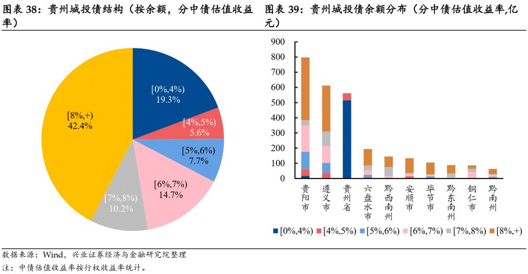 1)当前贵州的存量城投债,剩余期限/距离行权期限主要分布在3年以内(占比77.1%),私募债占比高达45.6%,且存量债的中债隐含评级相对偏低(全部在AA及以下),中债估值(按行权收益率)水平在8%以上的占比超4成。