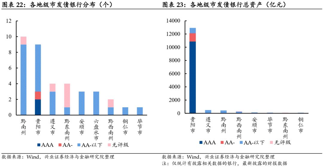 银行资源分布:从发过债的地方性银行(城商行、农商行等)数量来看,黔南州、贵阳市等地区的区域性银行数量较多;但从有披露总资产数据的发债银行分布情况来看,贵阳市遥遥领先,其他地级市则明显偏少。