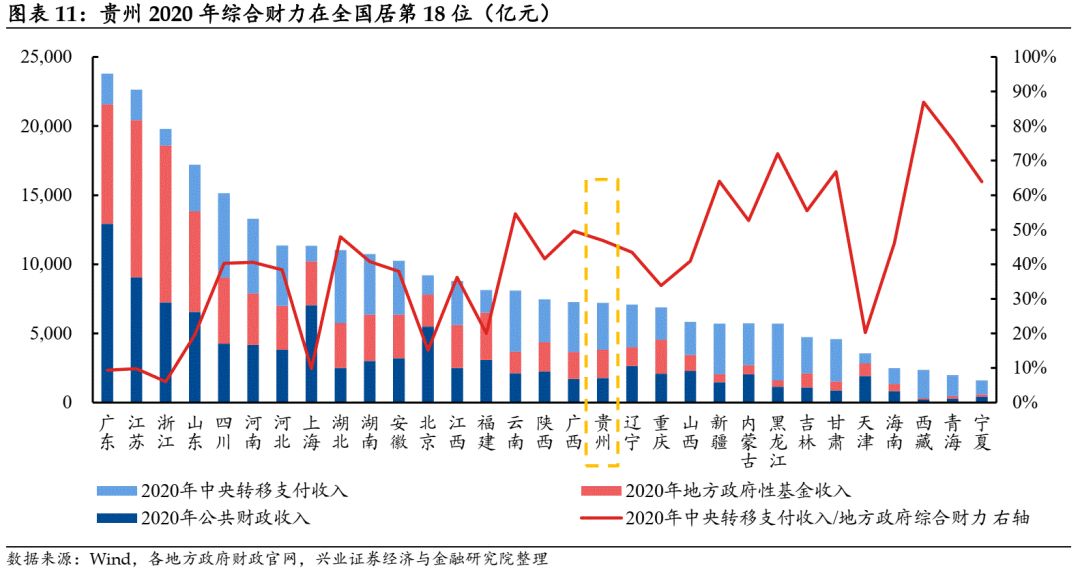 从包含中央转移支付的综合财力(=一般公共预算收入+政府性基金收入+中央转移支付)来看;考虑中央转移支付后,贵州2020年的地方综合财力为7212.52亿元,在全国位居第18位。