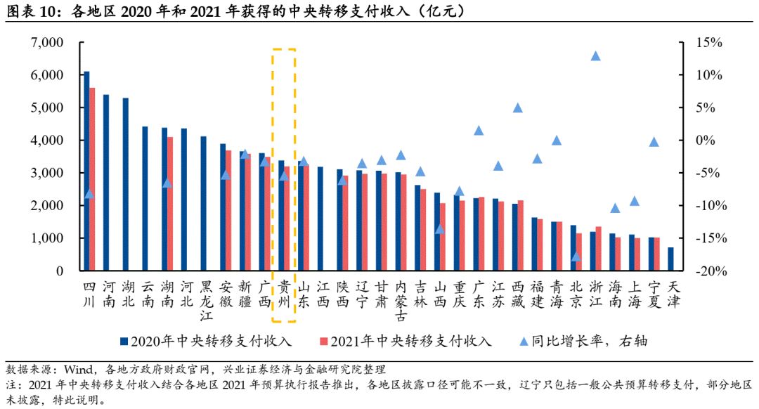 从中央转移支付来看,由于2021年数据披露不完善,因此主要依据2020年的数据进行横向对比。2020年贵州获得的中央转移支付为3378.49亿元,位居全国第11位,中央对贵州的支持力度较大。