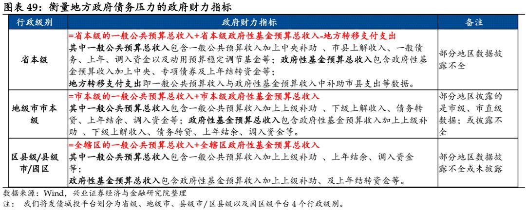 2 我们以发债城投平台(城投平台的定义主要结合wind口径、中债口径及发债企业的主营业务综合判断所得)可能形成的隐性债务作为隐性债务口径,隐性债务=广义贷款(贷款+非标)+债券+其他应收-其他应付;测算中涉及资产负债表中的以下会计科目:短期借款、长期借款、应付短期债券、应付债券、一年内到期的非流动负债、其他应收款、其他应付款。为避免重复计算,我们将存在母子关系的子公司债务情况剔除。