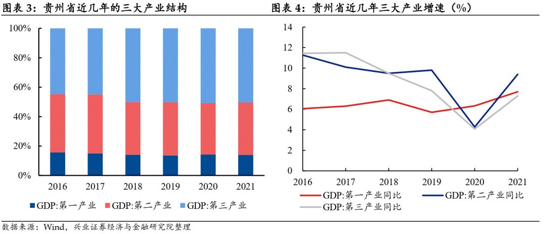 经济维度:2011年以来,贵州省GDP增速常年高于全国水平;根据2021年初步核算结果,贵州GDP总量居全国第22位,位居中下游水平;从三大产业结构来看,2021年贵州第三产业占比小幅下滑。