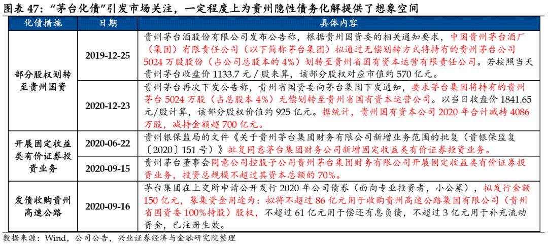 2019年底以来,关于茅台部分股权划转至贵州国资等一系列“茅台化债”举措引发市场关注,为贵州隐性债务的化解提供了想象空间,也在一定程度上提升了市场信心。