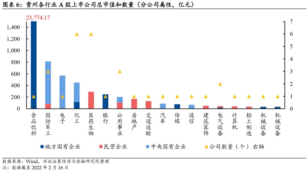 从贵州省的上市公司分布来看,贵州茅台“一枝独秀”,食品饮料、国防军工、电子、化工、医药生物等行业助推当地经济发展。
