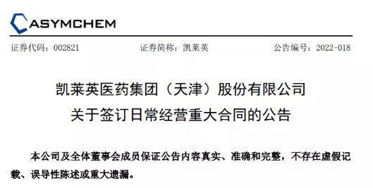 2月20日,凯莱英发布公告,称其持续为某制药公司的一款小分子化学创新药物提供合同定制研发生产(CDMO)服务,近日又与该客户签订了相关产品新一批的《供货合同》,金额折合人民币约35.42亿元,供货时间为2022年。