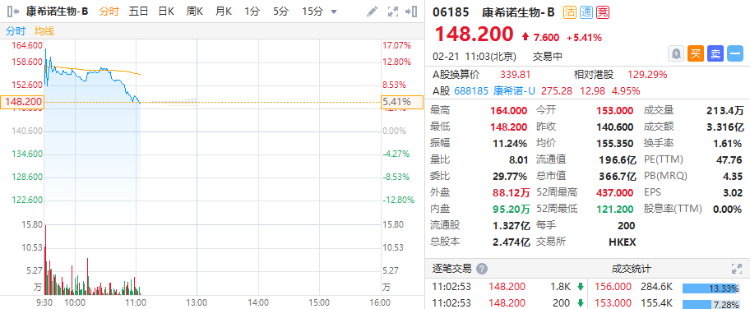 今日开盘,康希诺生物-B一度涨超15%。截至发稿,该股涨5.41%,报148.20港元/股。