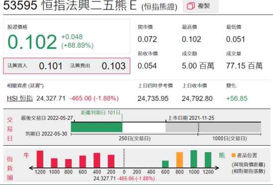 1、强势轮证:恒指法兴二五熊(53595),上周五上涨88.89%;