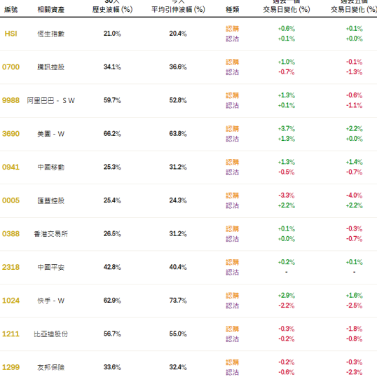 上周五恒指相关权证的平均引伸波幅报约20.4%,继续小幅上升。个股方面,腾讯控股、美团、阿里巴巴、中国移动、快手等相关认购证的引伸波幅均按日上升;汇丰控股等相关认沽证的引伸波幅按日下降。