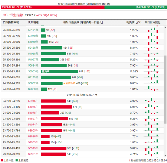 街货分布方面,至上周五,恒指牛证街货在收回价23800点至24300点之间,累计相当约2665张期指合约;恒指熊证街货在收回价24900点至25400点之间,相当约2896张期指合约。