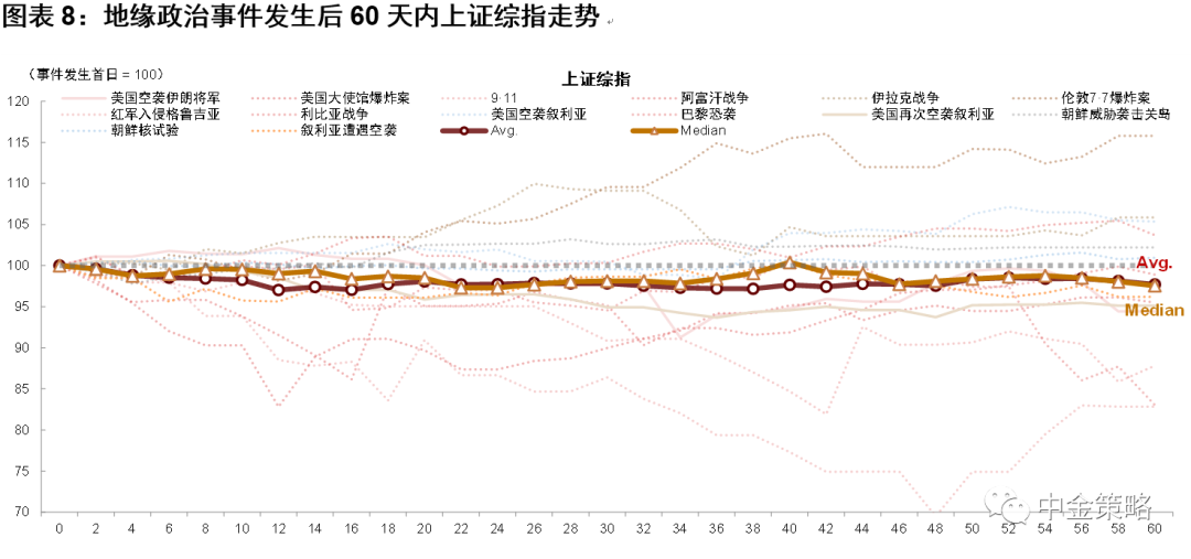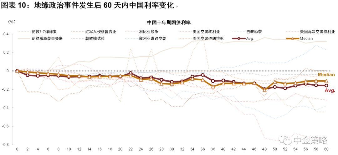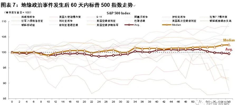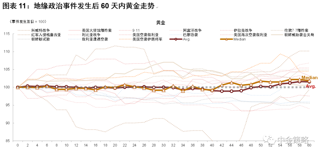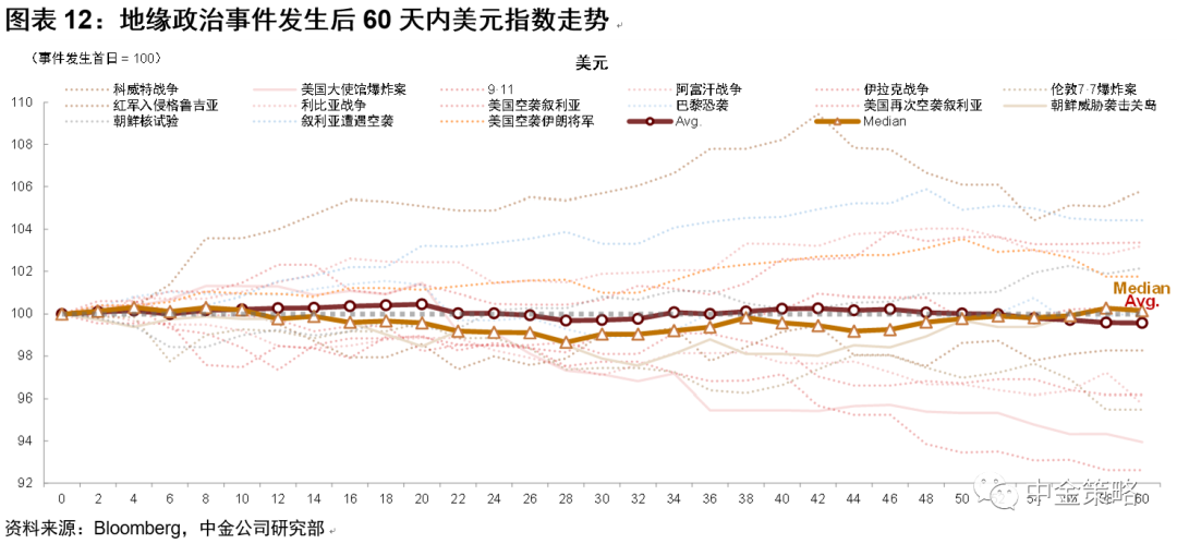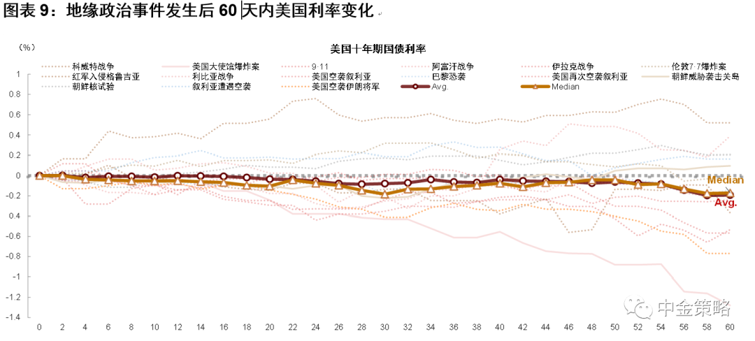 由于地缘政治风险指数走势呈脉冲式波动特征,可能减弱相关性分析的可信度,我们同时使用事件分析方法交叉验证:首先根据风险指数峰值确认近期15件地缘政治事件,然后观察大类资产在这些风险事件期间的走势。事件分析结果与相关性分析结果基本一致,同时发现地缘政治风险对资产价格影响的持续性不强,资产价格往往在事件发生的1个月内恢复到调整前水平。
