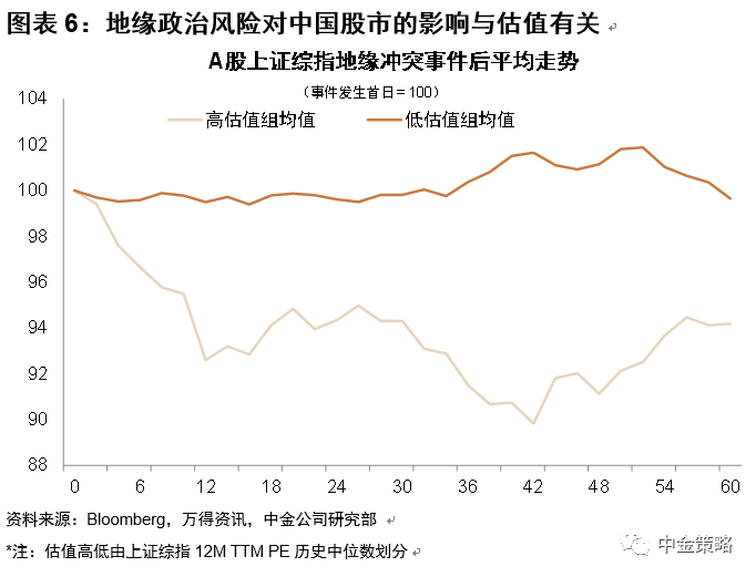 此外,我们发现地缘政治风险对中国股市的影响与估值有关。当股票估值低于中位数时,股指仍可以在地缘政治事件后逆势上涨。在当前宏观环境、政策前景和估值水平下,我们认为中国市场走势受地缘政治风险影响相对较小,更容易走出独立行情。
