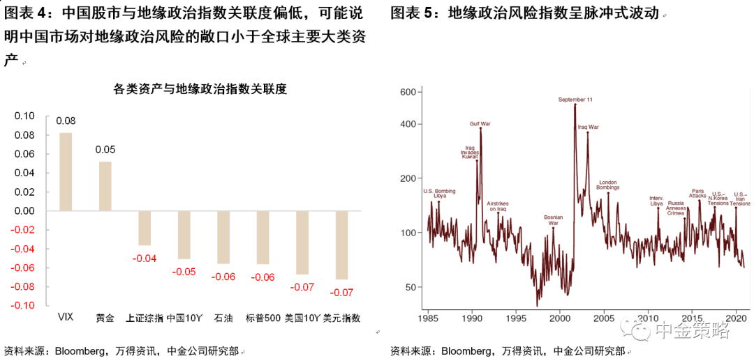 3)目前美元的对冲效果不确定性较高。根据中金外汇组分析,美元往往在加息周期启动后走向贬值,可能限制对冲效果。从资产价格历史相关性看,我们也发现美元对地缘政治风险的对冲效果并不好。我们建议继续标配黄金,对冲组合风险。