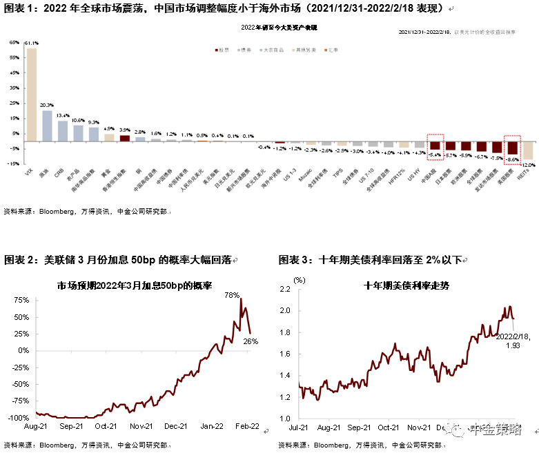 2022年以来,沪深300下跌5.4%,标普500下跌8.6%,中国相对海外市场韧性有所凸显,与我们年度展望中预期一致。地缘政治风险增加,也导致加息预期小幅降温,市场预期3月FOMC会议50bp加息概率已经由78%降至26%左右(图表2),2022年预期加息次数降至6次以下,十年期美债利率再次回落至2%以下(图表3)。