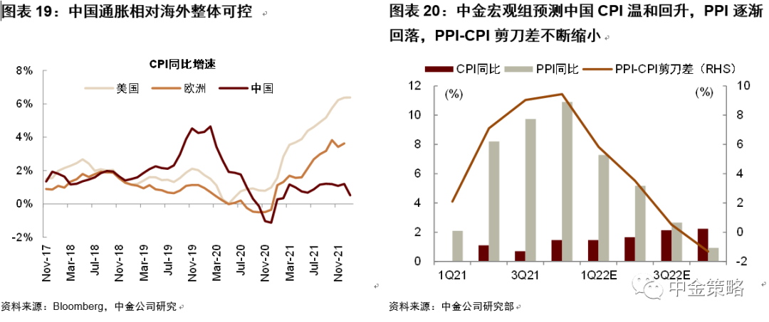通胀预期上升:俄罗斯出口石油和天然气占全球的12%和21%,乌克兰是全球重要谷物与有色金属出口国。俄乌紧张局势升级可能推高商品供给溢价,全球通胀预期进一步上升,海外央行货币紧缩加快,流动性收缩预期导致海外风险资产调整。与供需共同推动造成高通胀不同,当前中国的通胀压力主要源于“双碳目标”下的供给约束。受国内需求偏弱和“保供顺价”措施影响,国内通胀压力仍然整体可控,对政策发力与市场预期尚未形成明显制约。