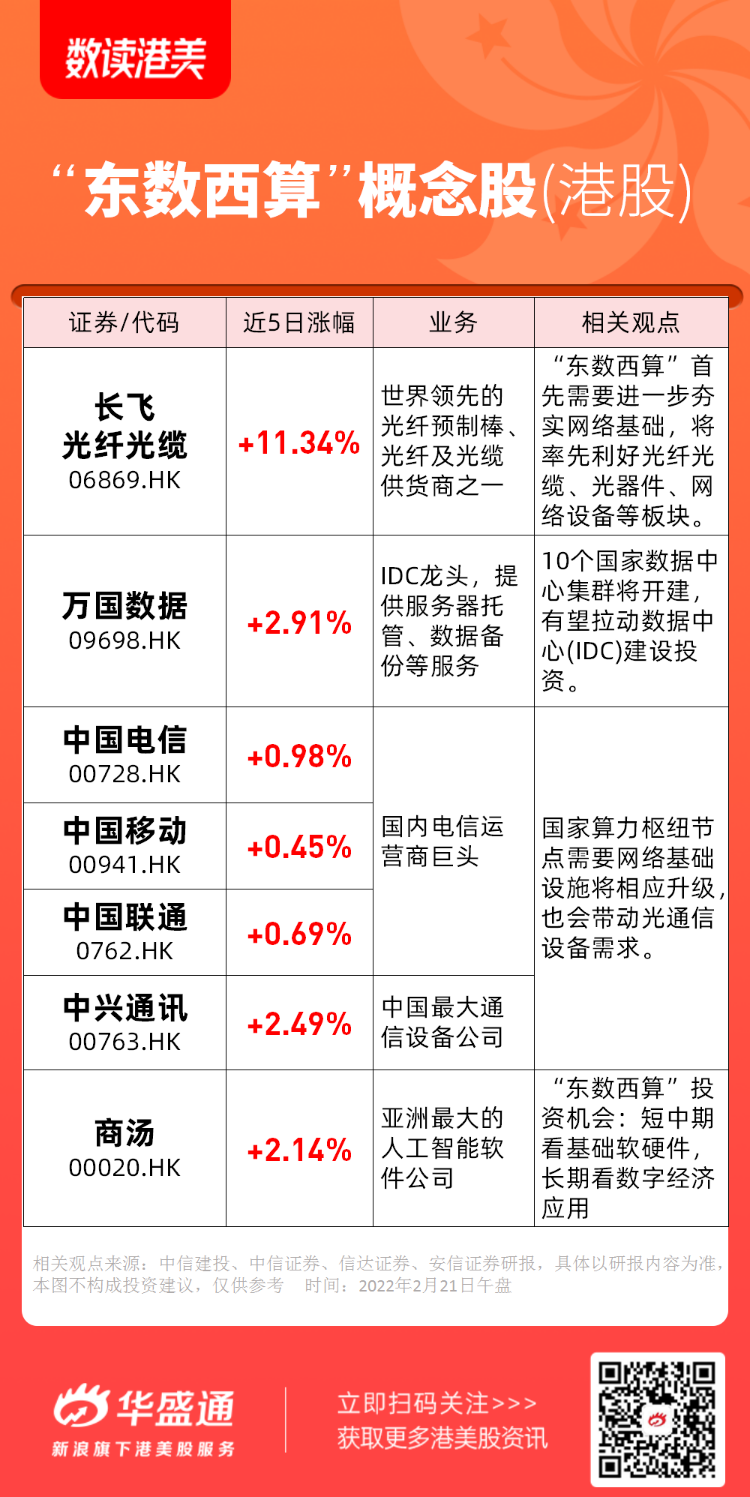 机构预计,“东数西算”工程将每年拉动4000亿元投资。今日(2月21日)市场相关板块集体爆发,Wind东数西算指数暴涨超过9%,港股市场中长飞光纤光缆 $06869.HK 一度涨超6%,一起看看详细概念股名单: