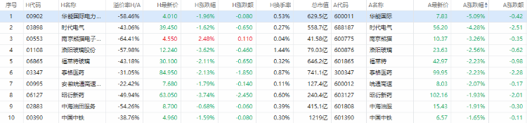 华能国际电力股份A股跌5.09%,H股跌1.96%,时代电气A股跌4.28%,H股跌1.62%,福莱特玻璃A股跌2.23%,H股跌2.11%。