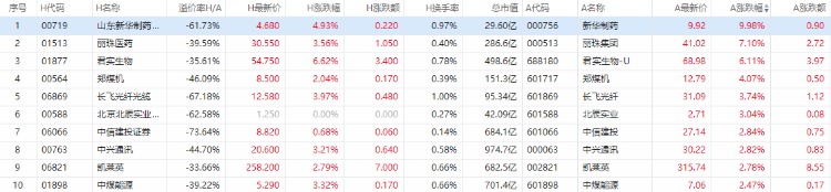 截至发稿,山东新华制药股份A股涨停,H股涨4.93%;丽珠医药A股涨7.1%,H股涨3.56%,君实生物A股涨6.11%,H股涨6.62%。