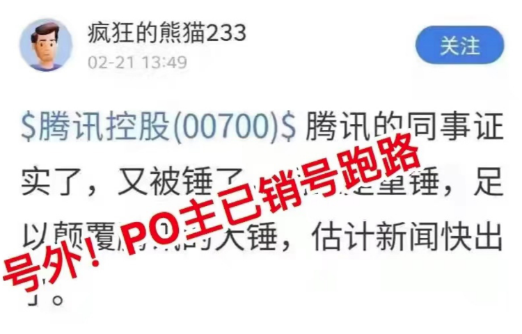 今天腾讯股价一度重挫6%,腾讯公关总监张军在朋友圈表示,“喊重锤的人,自己销号了”。