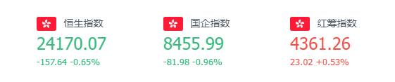 截至周一收盘,恒指跌0.65%,报24170.07点,国企指数跌0.96%,红筹指数涨0.53%。恒生科技指数大跌2.78%,微盟、哔哩哔哩跌近10%,快手跌超7%,腾讯跌超5%,百度、美团、阿里跌4%。