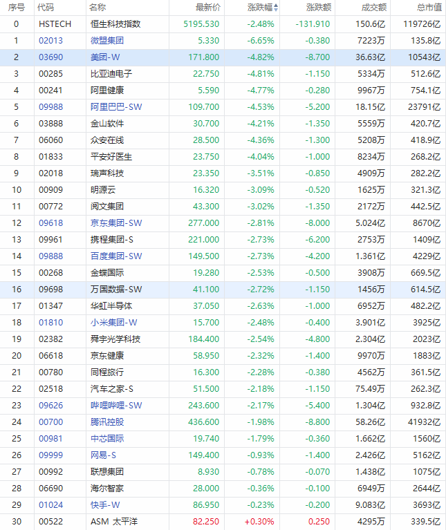 科网股普跌,美团跌4.82%,报171.8港元每股,成交额36.63亿港元;阿里跌超4.5%;京东、百度、小米齐跌逾2%;B站,腾讯跟跌。