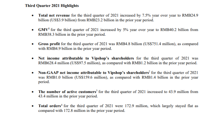 唯品会董事长兼CEO沈亚表示:“2021年第三季度,唯品会的好货政策已取得积极进展,不仅帮助核心品牌合作伙伴提高销售效率,同时也扩大高价值用户规模。未来,唯品会还将继续努力,持续推动业务保持稳健、高质量的增长。”