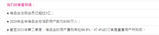 据唯品会官网披露,其注册会员多达3亿,且用户粘性较高。截至2021年第二季度,唯品会的用户复购率达88.8%,97.4%的订单是重复用户所购买。