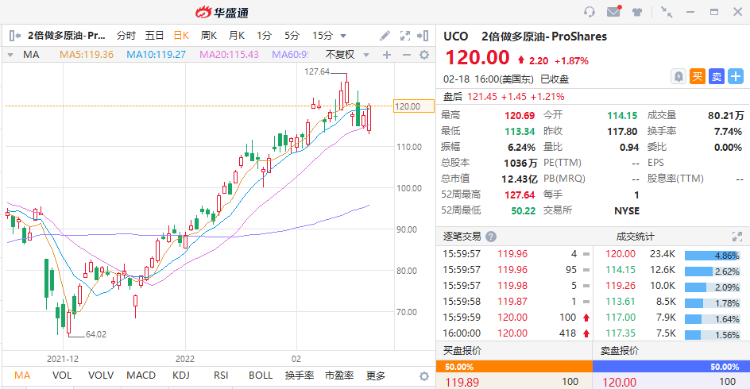 UCO为2倍追踪彭博商品平衡指数WTI 原油指数表现的ETF,今年以来累计涨幅达38.28%。