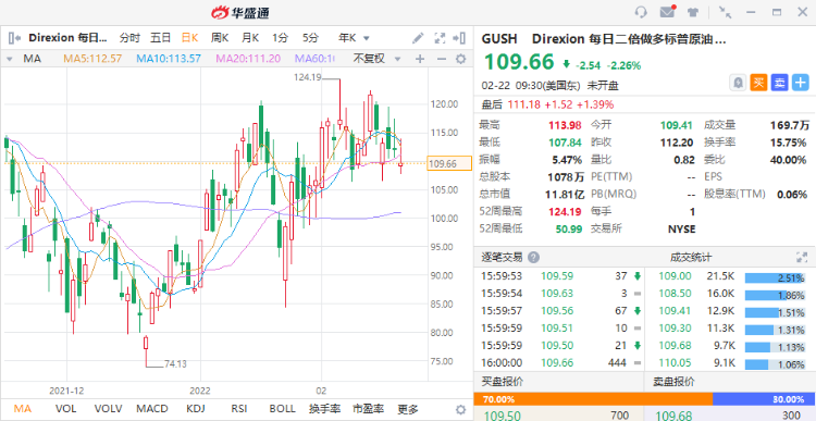 GUSH为两倍追踪标普石油和天然气勘探和生产精选行业指数表现的ETF,该ETF今年以来累计涨幅达24.94%,去年全年涨幅为129.94%。